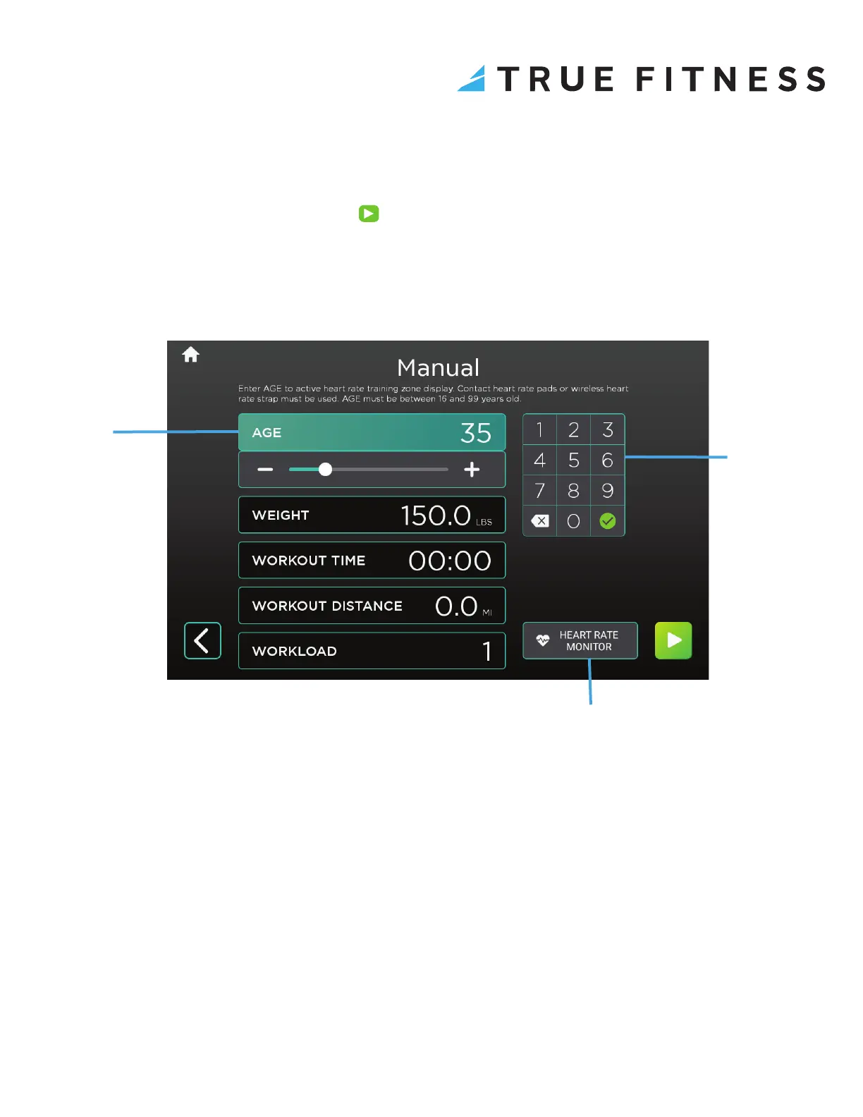 These screens allow users to input their personal information or workout goals prior to beginning a workout. To set a value,