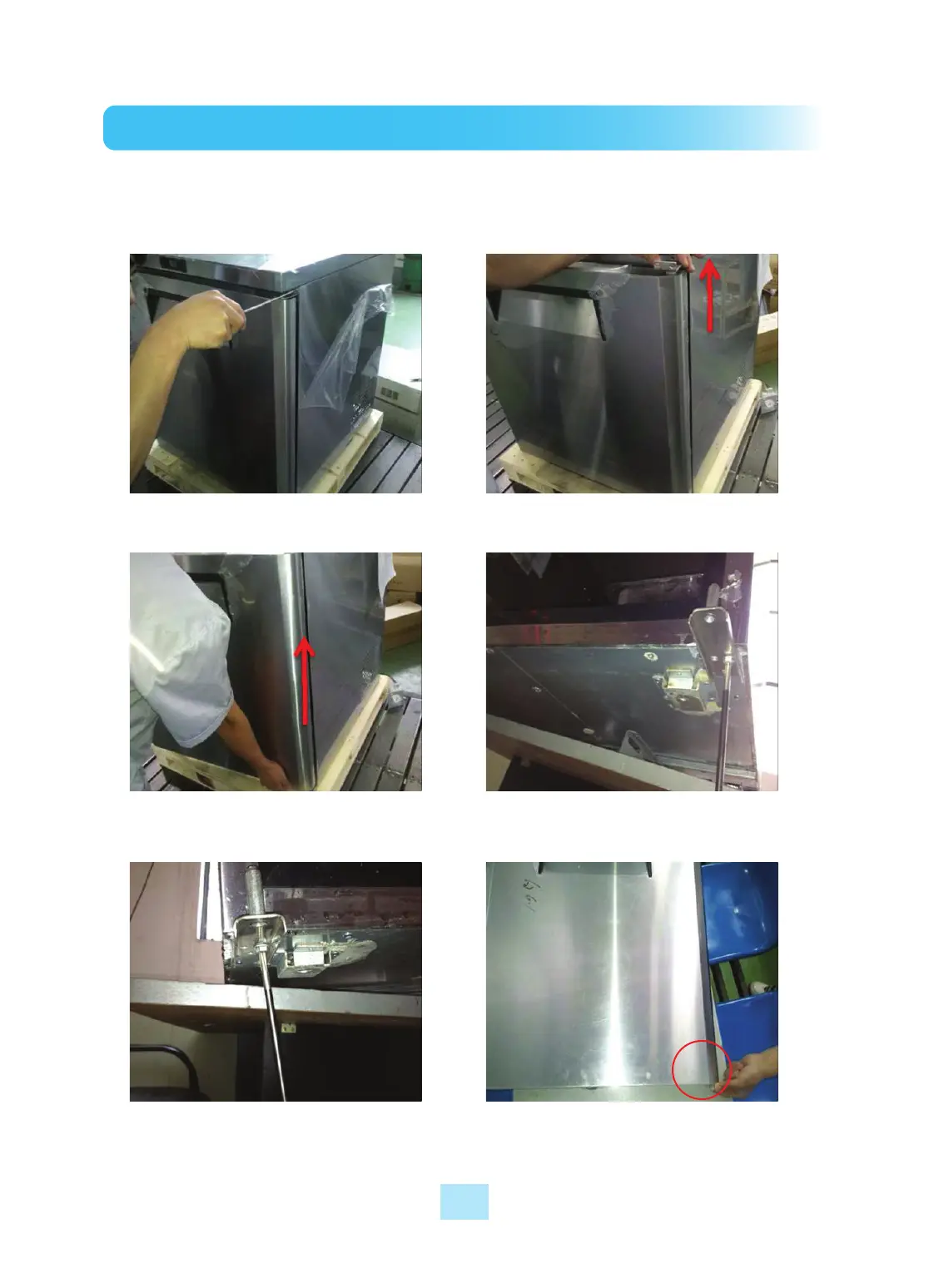 1) Unscrew the top hinge. 2) Remove the top hinge from the unit.