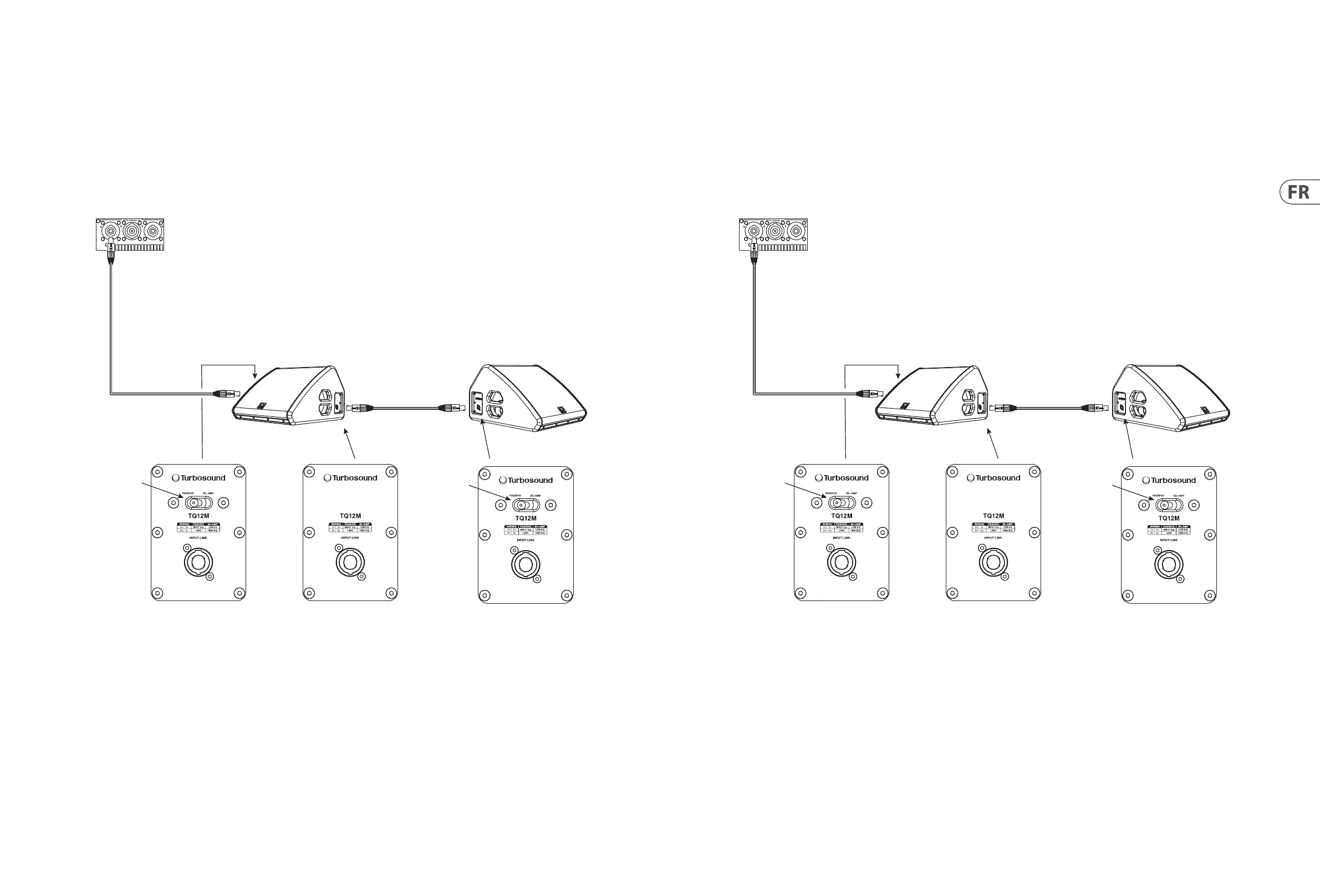 Le câble à quatre conducteurs NL4 pour le premier moniteur TQ utilise la broche 1 +/- et le deuxième moniteur TQ utilise la broche 2 +/-.