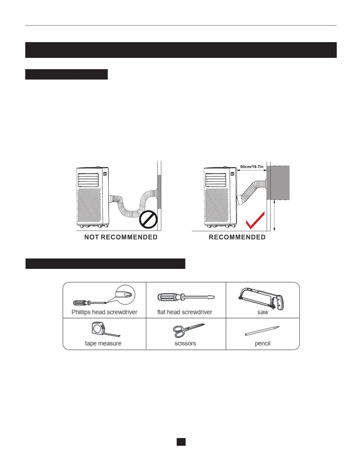● The air conditioner should be placed on a firm floor to minimize noise and vibration. For safe and secure