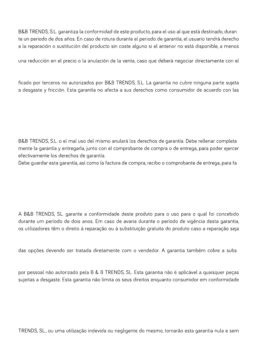 Los clientes deben contactar con el servicio técnico autorizado de B&B TRENDS, S.L. para la repara-
