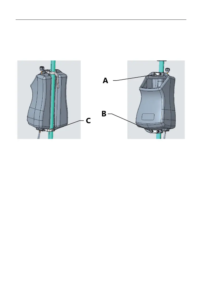 b) Befestigen Sie den Tank mit zwei Klammern am Rohr des Steuergriffs.