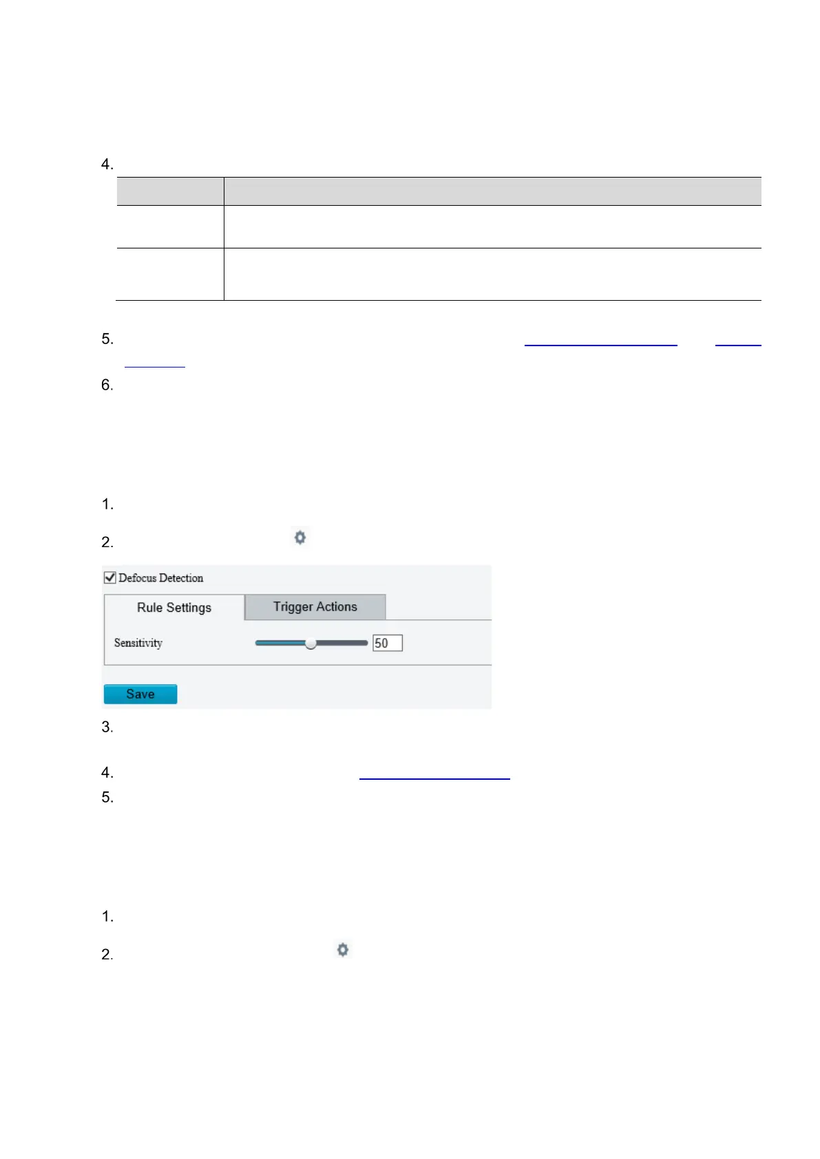 Defocus detection detects lens defocus. The camera reports an alarm when the detection rule is