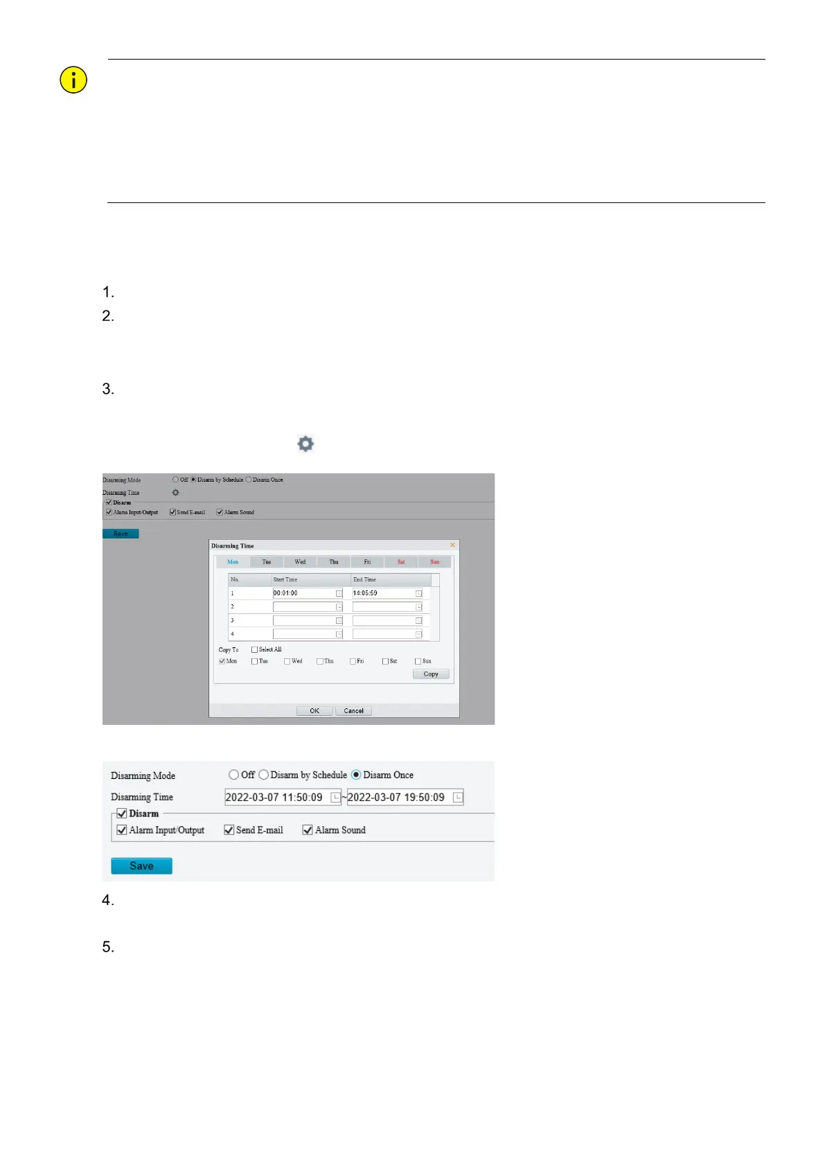Configure disarming schedule or time according to the disarming mode you chose. The disarming
