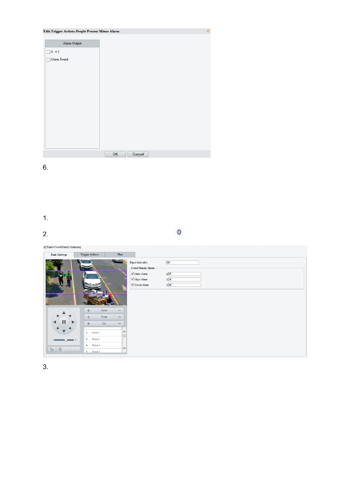 Crowd density monitoring monitors the number of people in a specified area and triggers an alarm if the