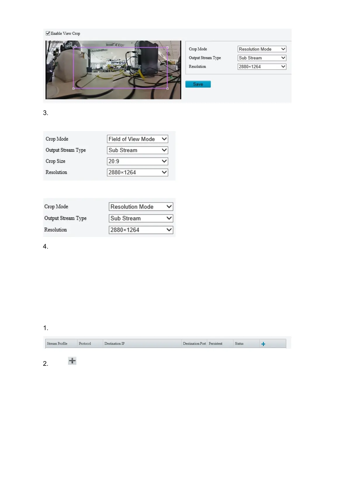 Field of View Mode: Size priority. Set the output stream type, crop size and resolution.
