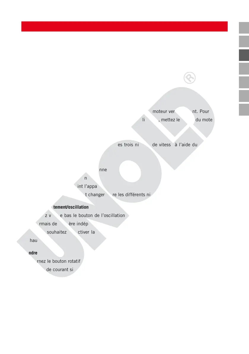 9. Appuyez vers le bas le bouton de l’oscillation situé sur la tête du ventilateur. L’appareil pivote