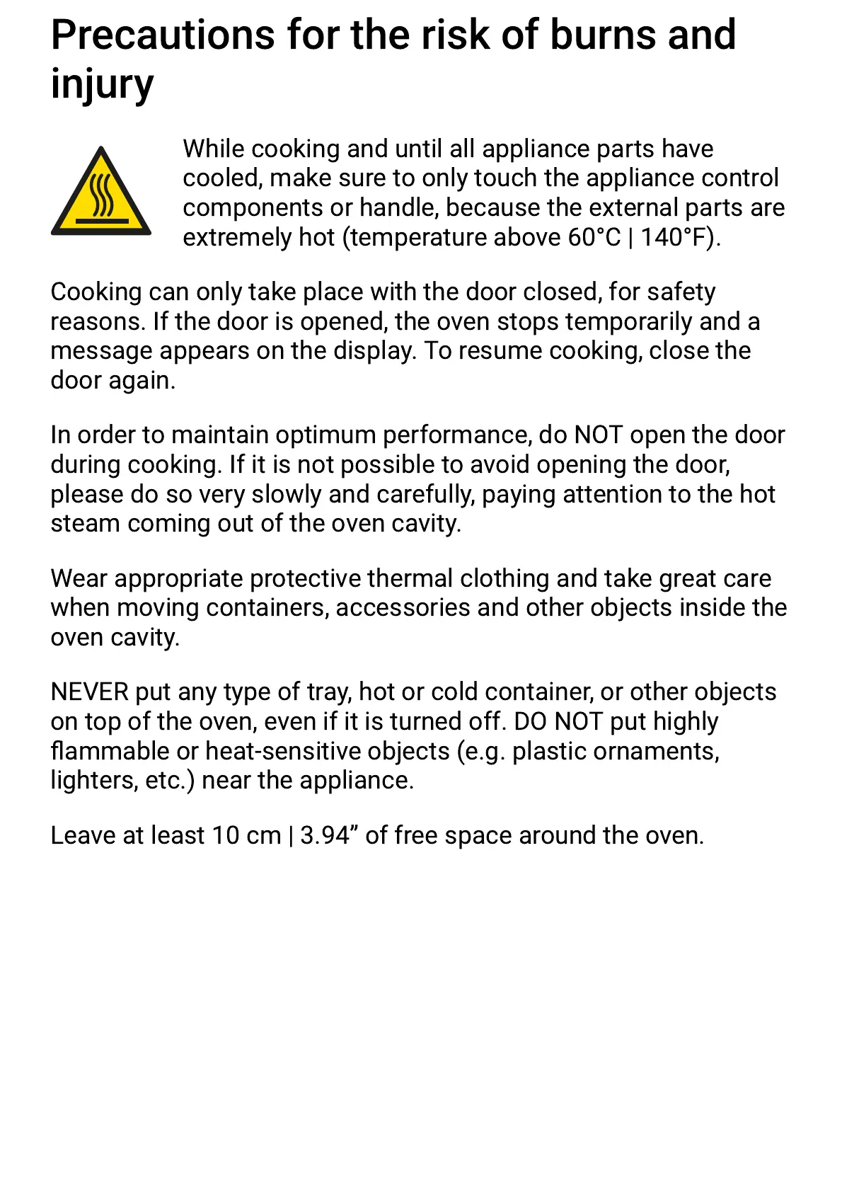 Leave at least 10 cm | 3.94” of free space around the oven.