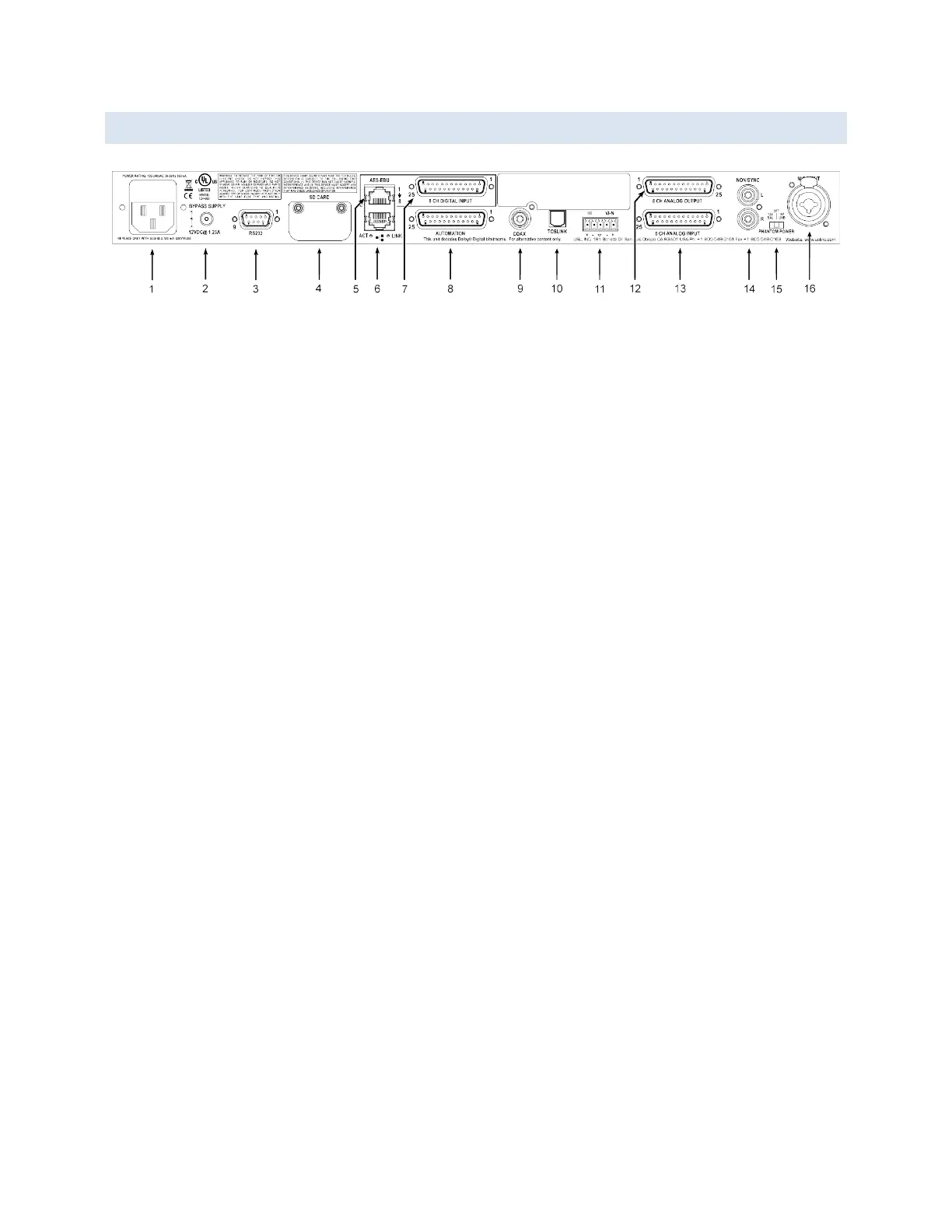 13. Six Channel Analog Input on DB25F – Balanced line inputs.