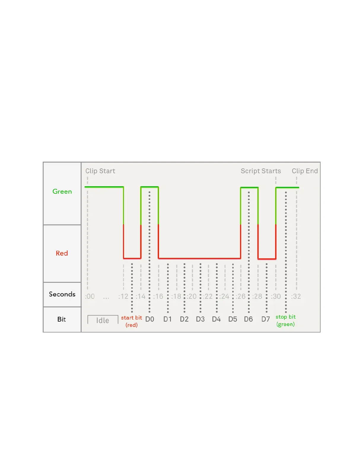 Figure 23 - Red/Green flash timing diagram. This sequence represents the letter A (0x41) and will start script 0.