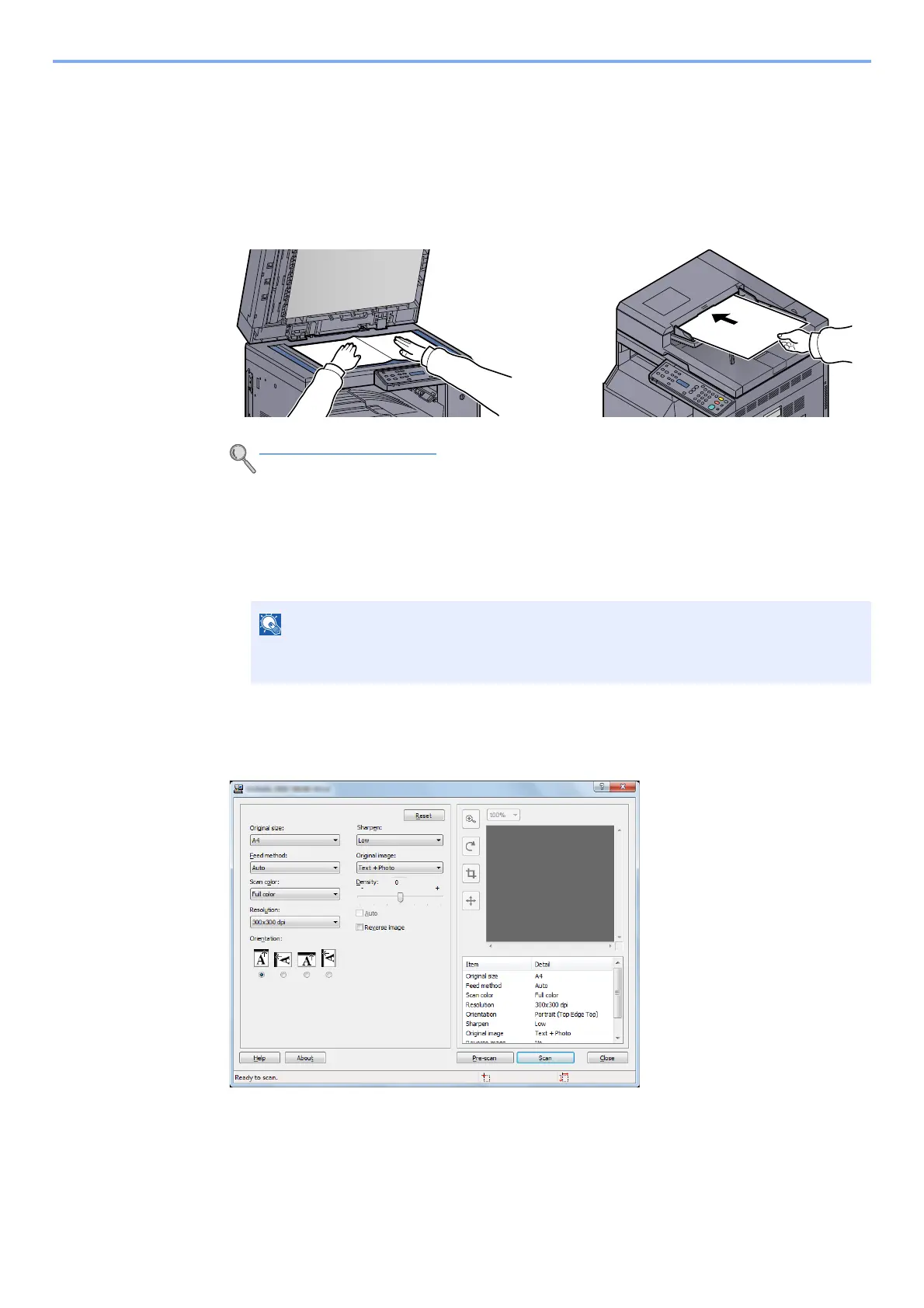 The procedure for scanning using the TWAIN driver is explained as an example. The WIA driver is used in the same