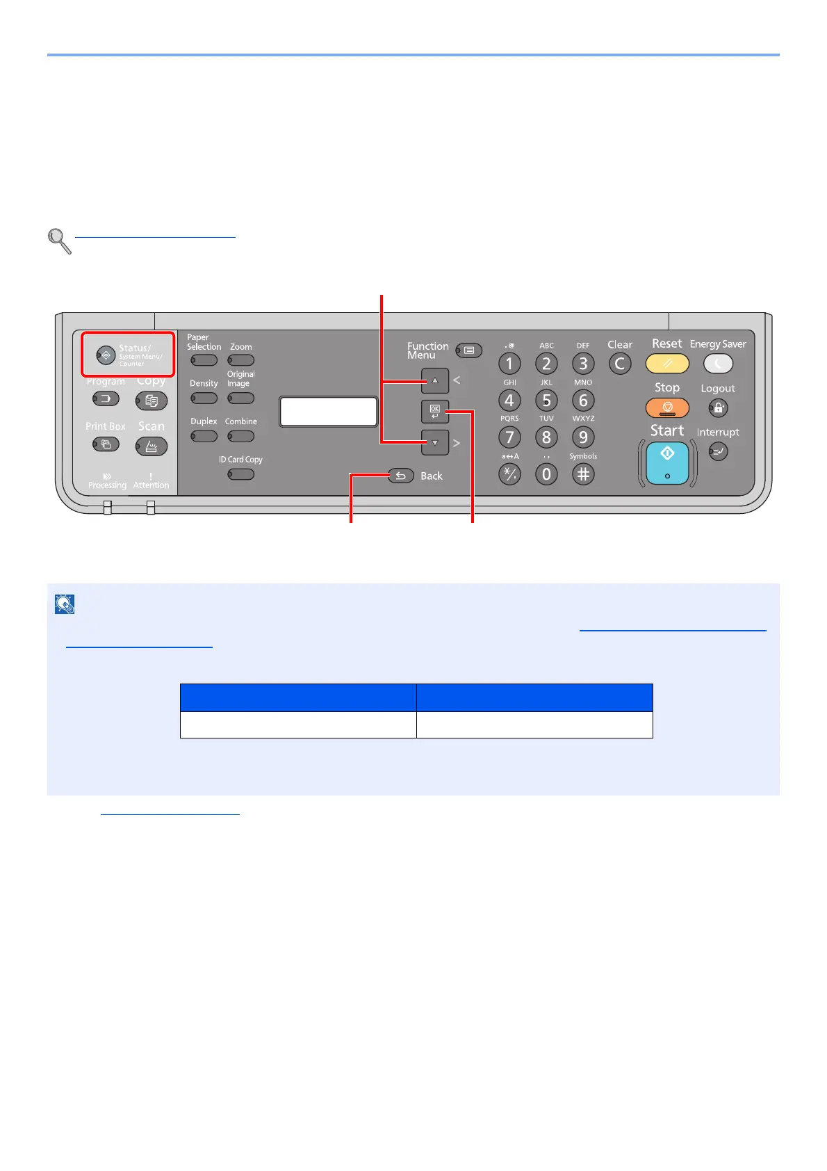 Press the [Status/System Menu/Counter] key to show the settings on the message display. Then, select from the