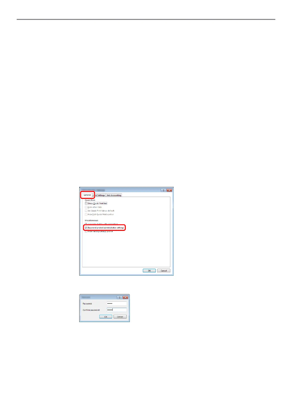 1 Select [Password protect administrator settings] on the [General] tab. The "Password"