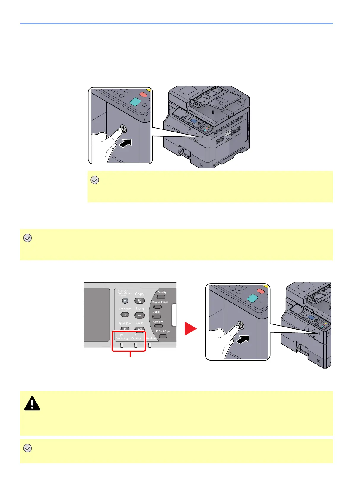 When the [Processing] indicator or [Memory] indicator is lit up or blinked, the machine is operating. Turning