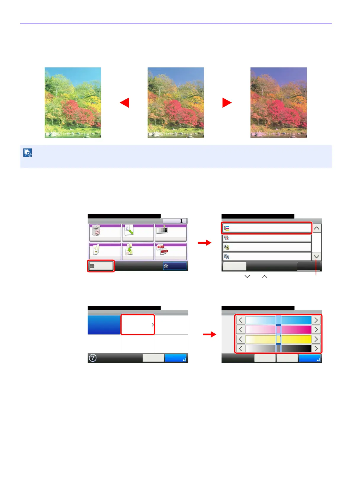 Press [<] or [>] on each side of the color to be adjusted (Cyan, Magenta, Yellow, Black) to