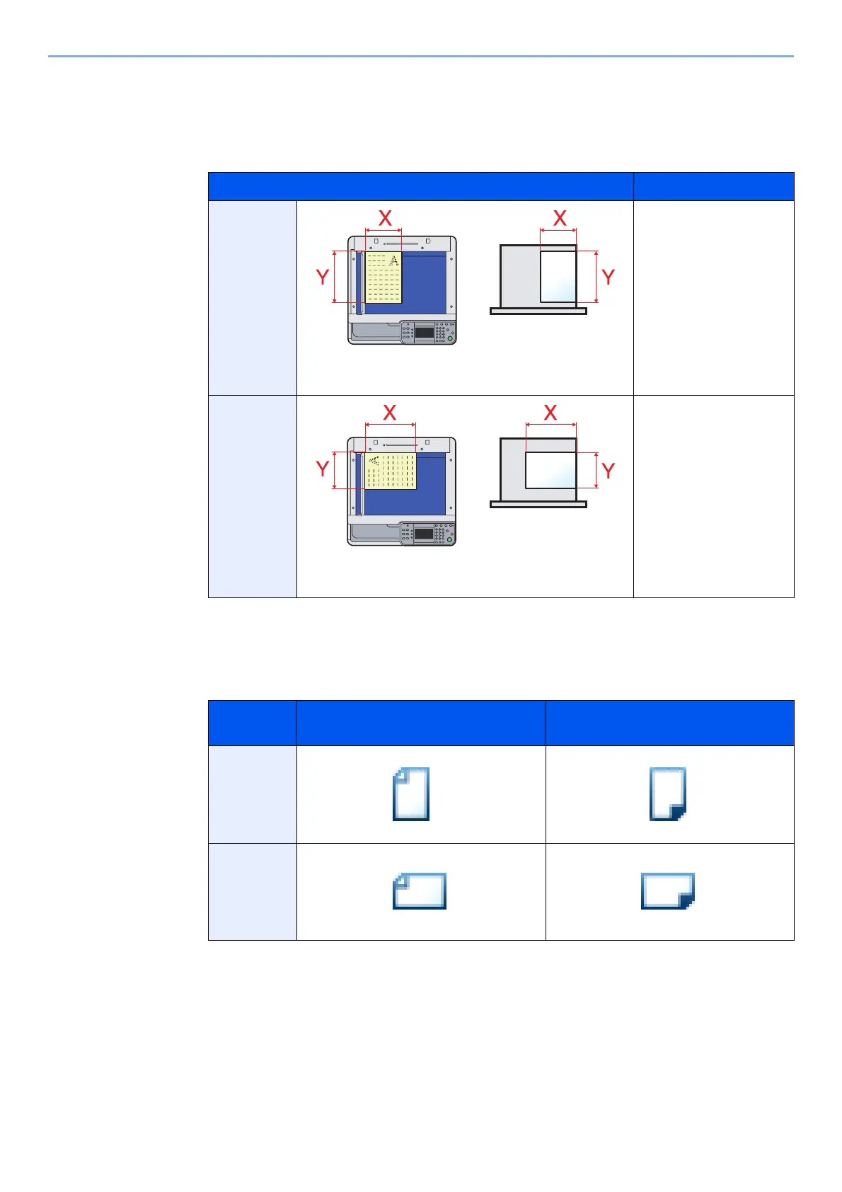 The following icons are used to indicate originals and paper placement directions on the touch panel.