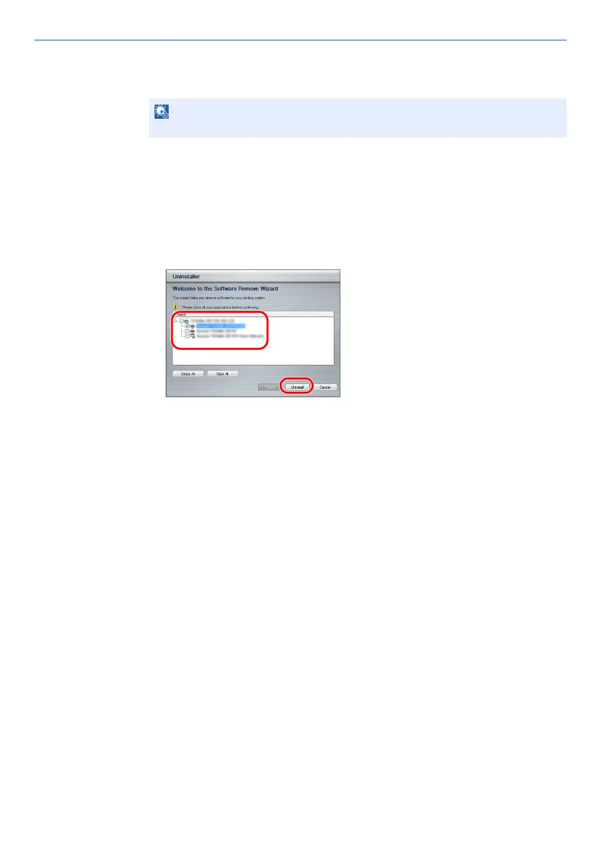 (name of product), and Uninstall Printing System Library to display the Uninstall Wizard.