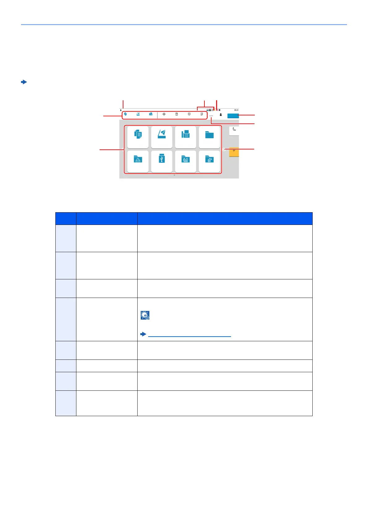 This screen is displayed by selecting the [Home] key on the operation panel. Selecting an icon will display the