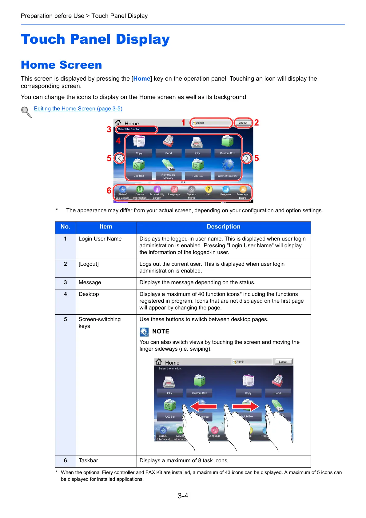This screen is displayed by pressing the [Home] key on the operation panel. Touching an icon will display the