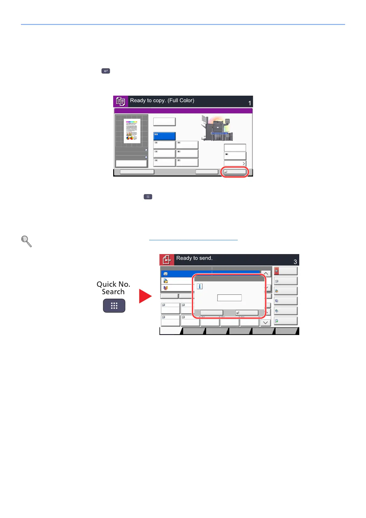 The [Quick No. Search] key performs the same action as the [No.] displayed on the touch panel. Use the Quick No.