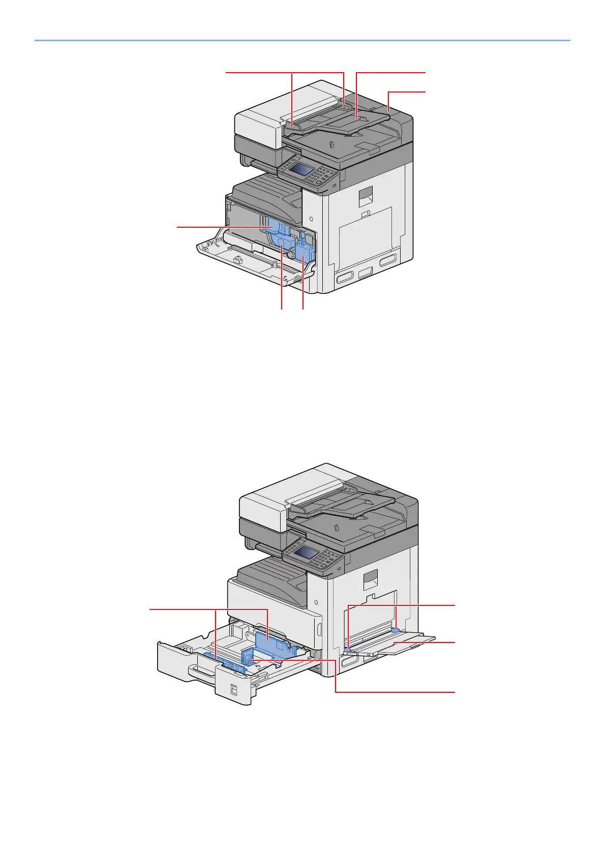 Het apparaat installeren en configureren > Onderdeelnamen (buitenzijde machine)