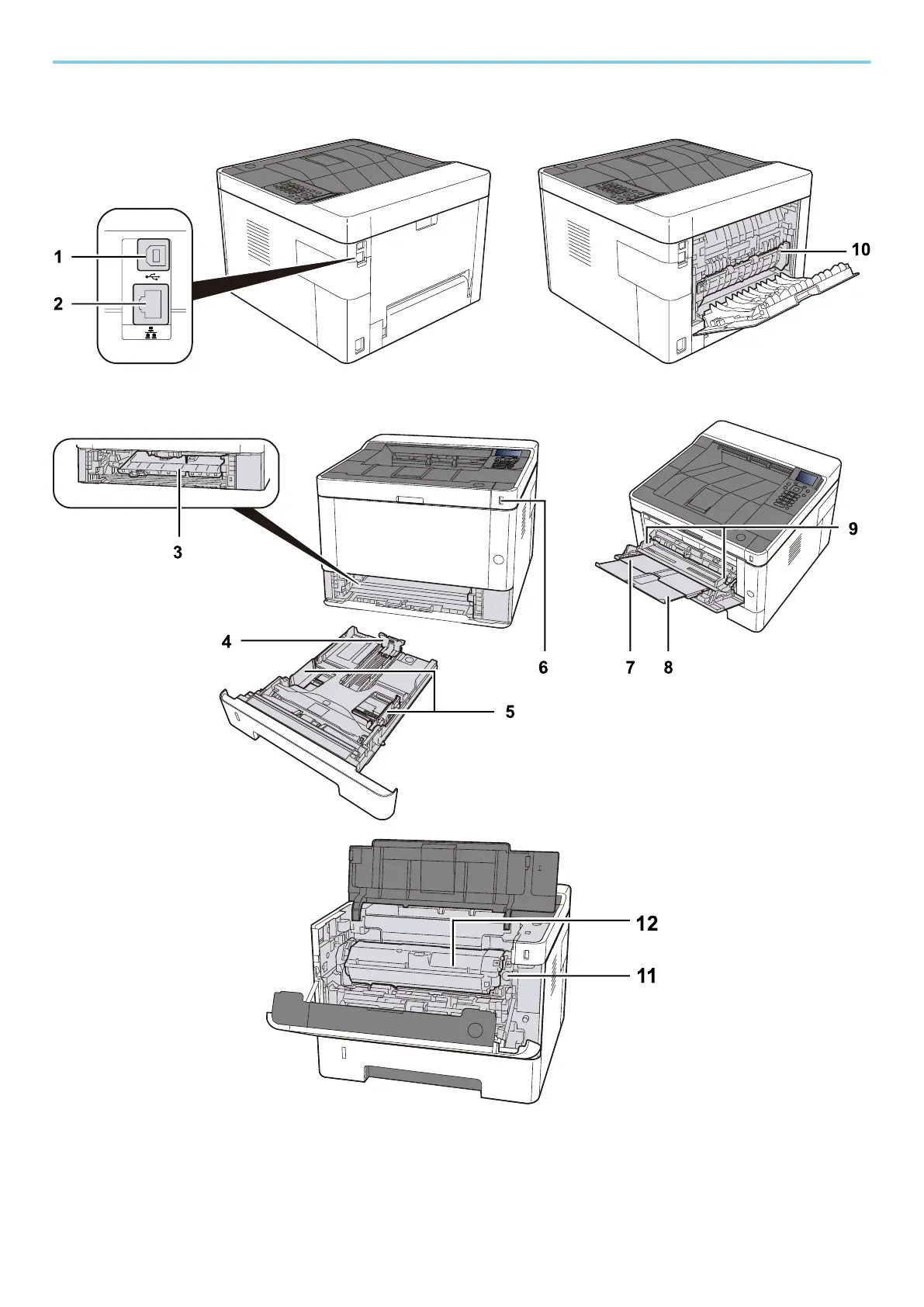 Het apparaat installeren en instellen > Onderdeelnamen (aansluitingen/binnenzijde)