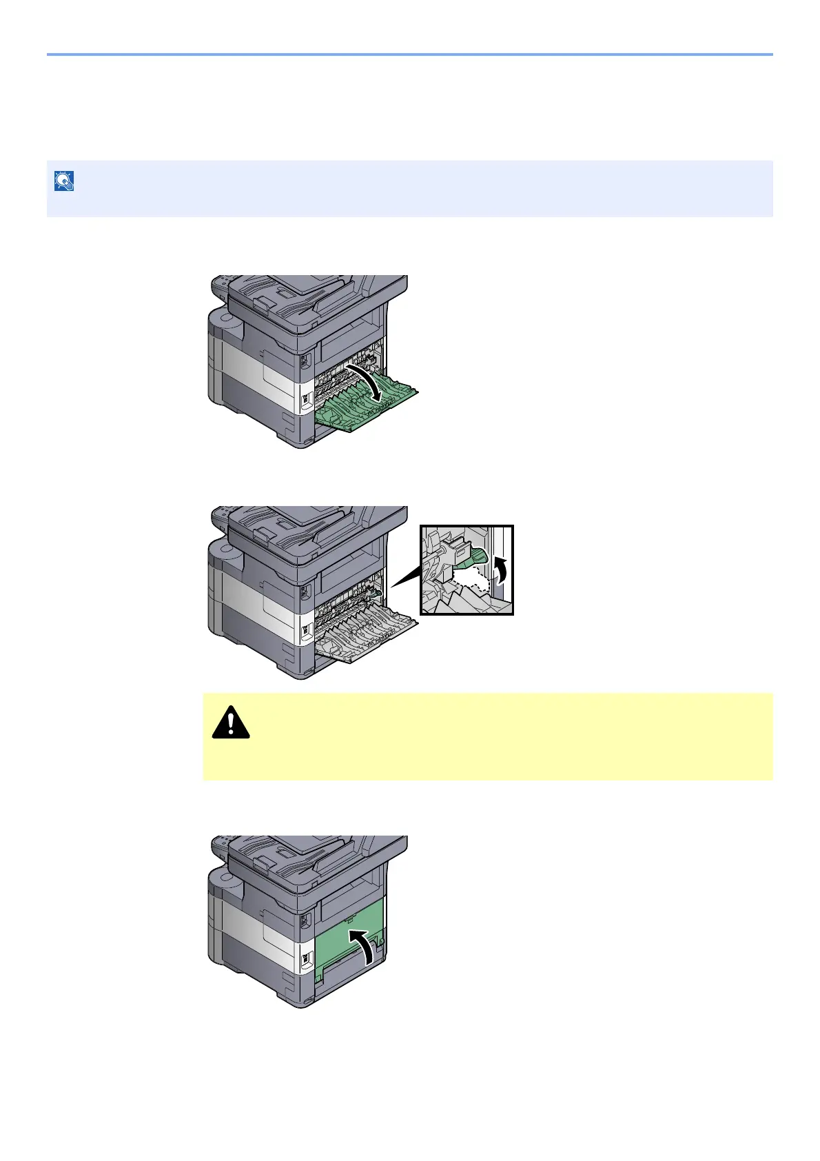 The fuser unit inside the machine is hot. Do not touch it with your hands as it may