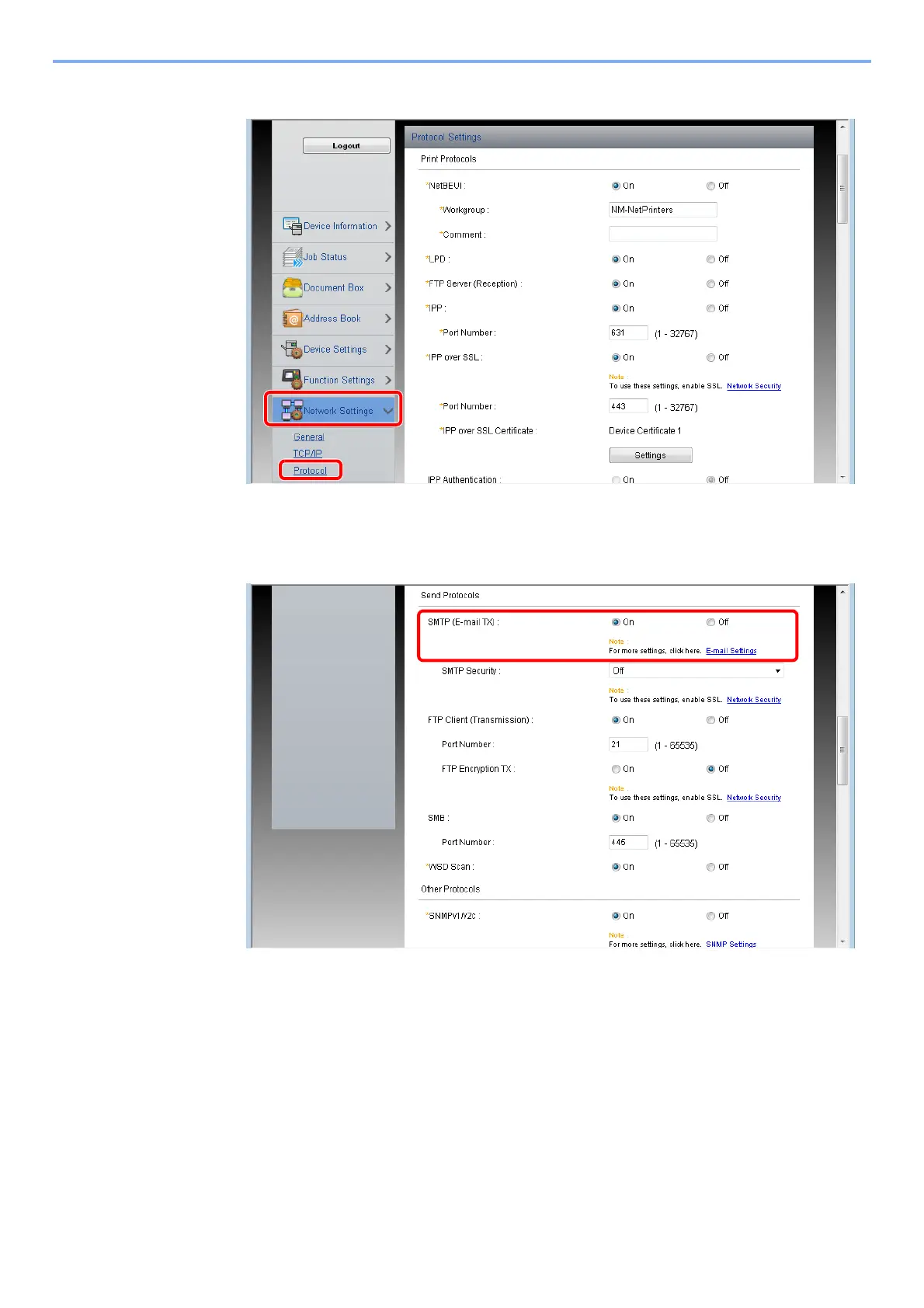 Set [SMTP (E-mail TX)] to [On] in the [Send Protocols].