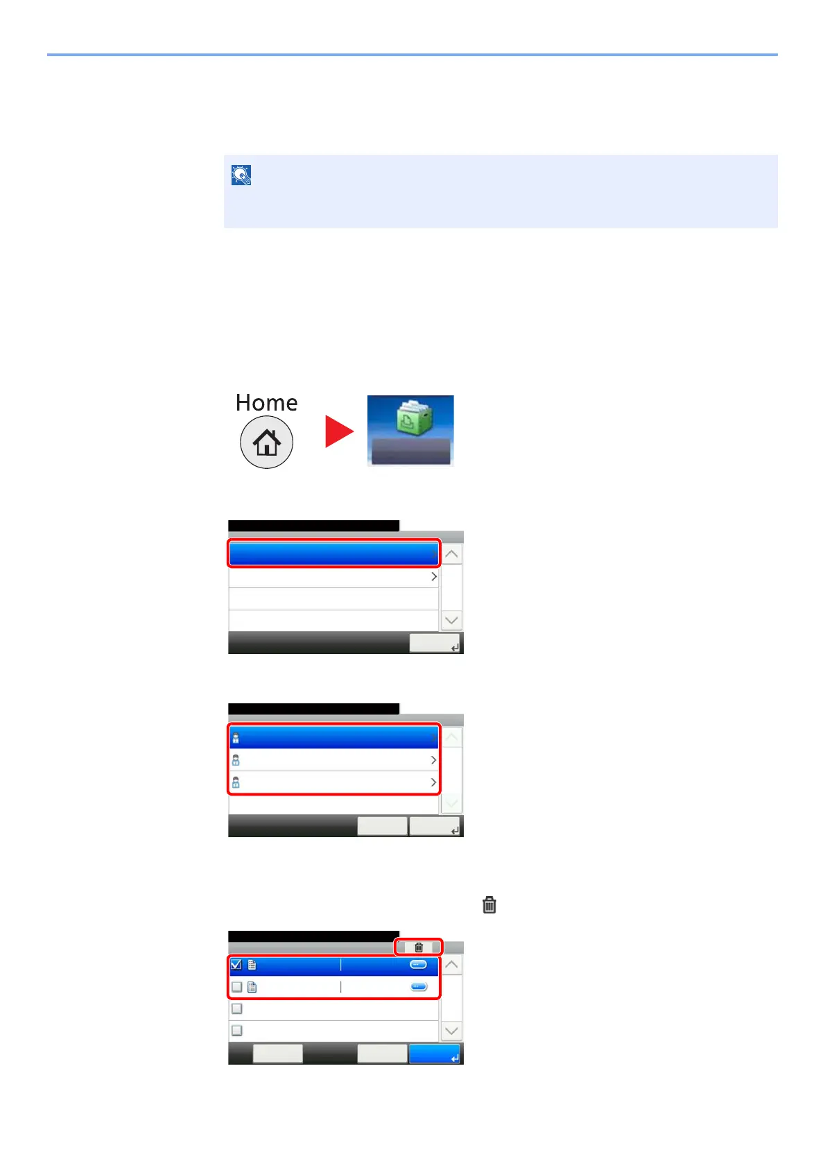 Delete the documents stored in a Stored Job box. The procedure is as follows.