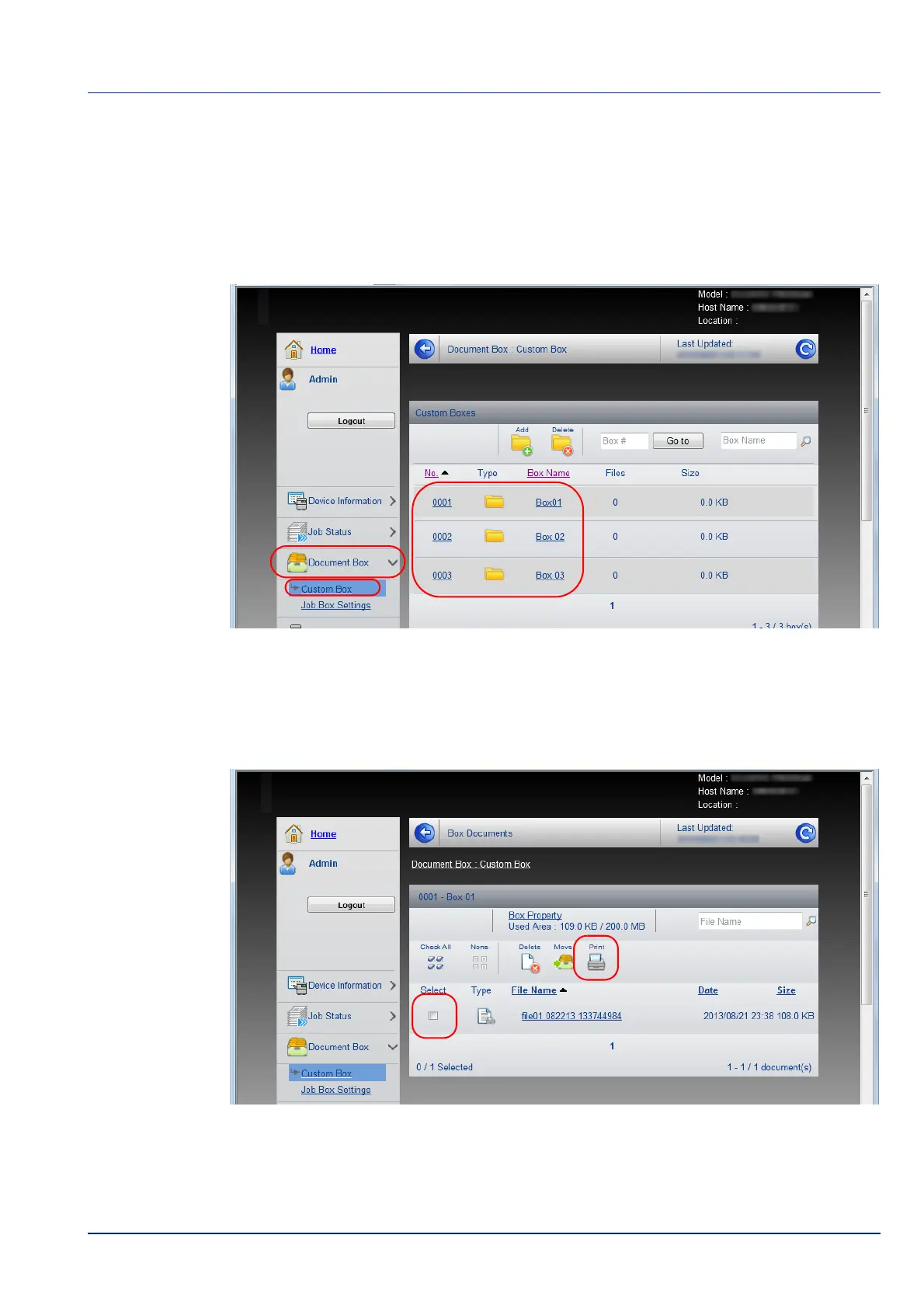 Een document opgeslagen in een custom box kan worden afgedrukt