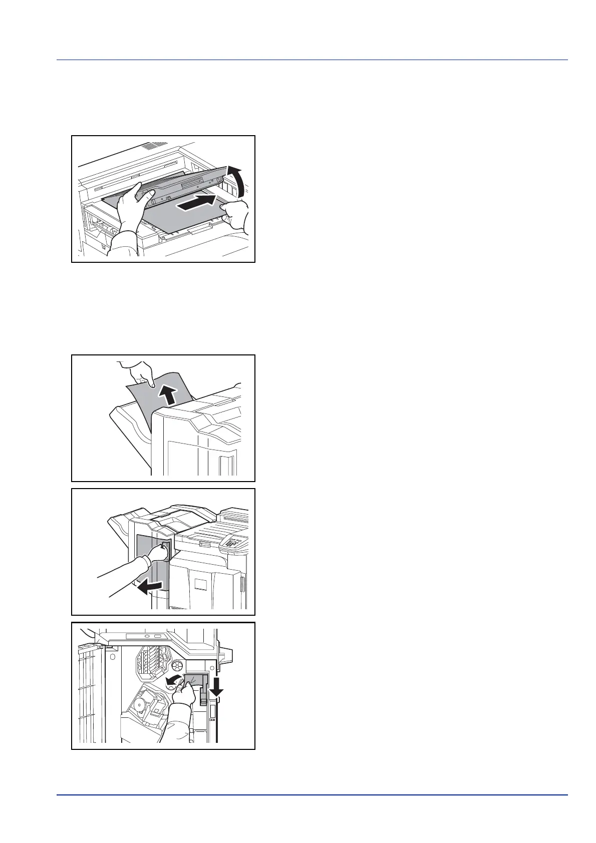 Als zich een papierstoring voordoet in de optionele finisher voor 1000 vel, volg dan de onderstaande stappen om de storing