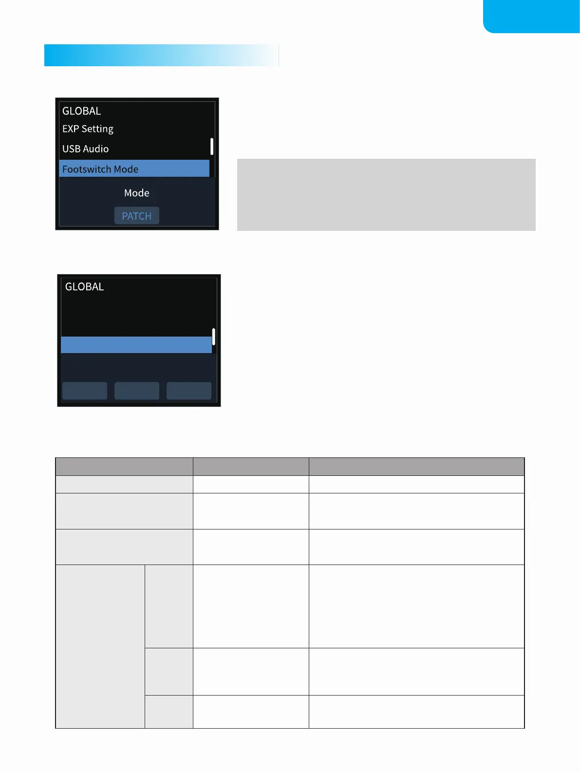 can select footswitch mode as PATCH mode or STOMP mode.