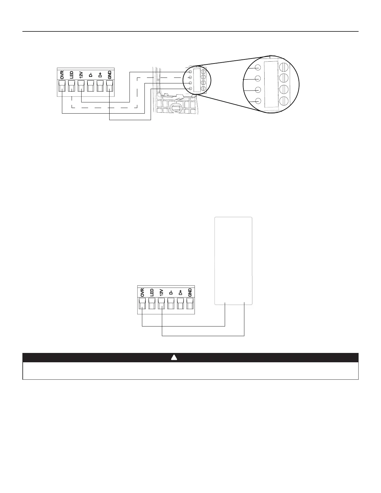 A miswiring that sends a 24 VAC signal to the 6-position terminal block (OVR, LED, 12V, D-, D+, GND) could