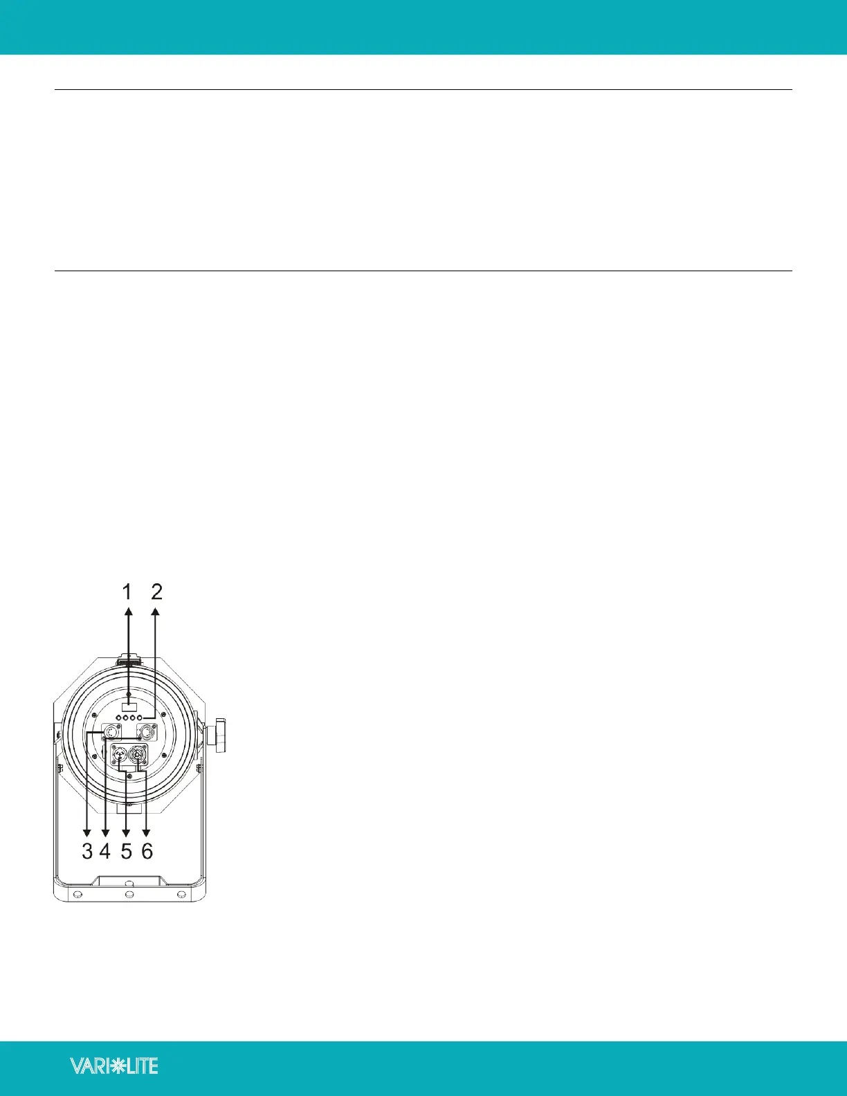 4 DMX/RDM thru. Connectors for DMX 512 operation, 5-pin XLR cable to link the next unit