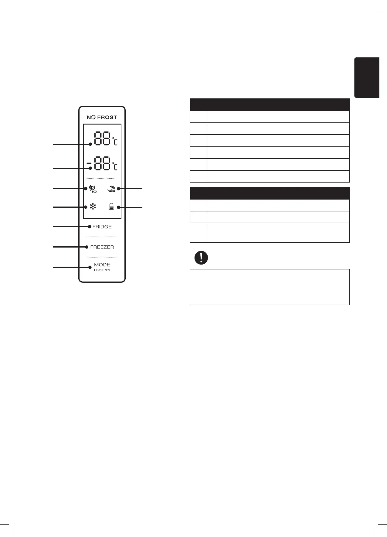 worden de koelkasttemperatuur (1) en de vriezertemperatuur (2) weergegeven. De standaard instelling van dit