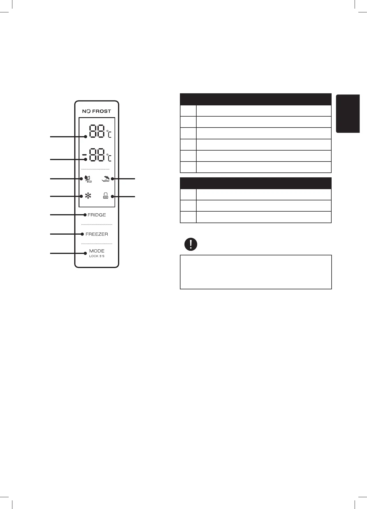 refrigerator temperature (1) and freezer temperature (2) are displayed. The default setting of this appliance for the