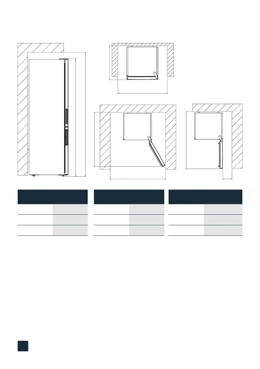 a készülék magassága, szélessége és mélysége a fogantyúval, a hűtőlevegő szabad áramlásához szükséges területtel, továbbá
