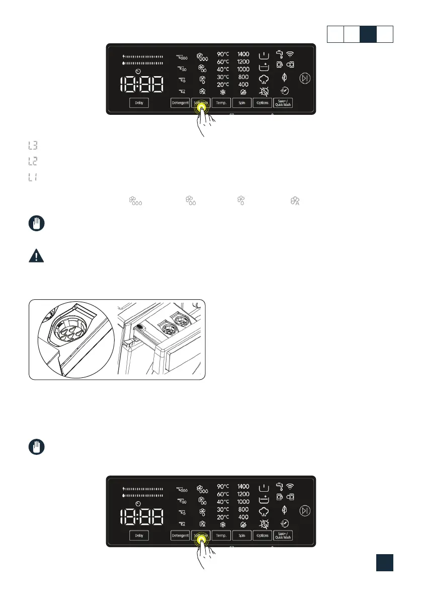 VAROVÁNÍ: Když je hladina změkčovače nízká, LED změkčovače začne blikat a pračka vás na to