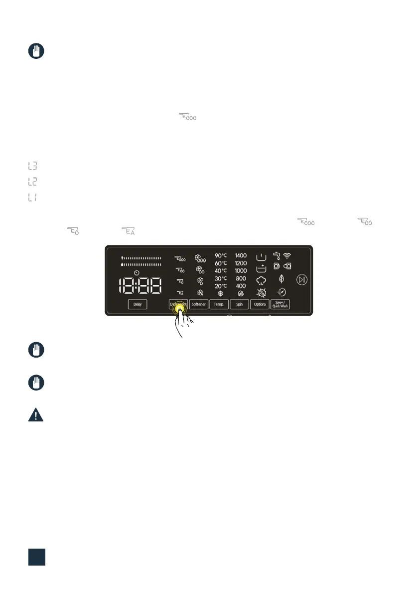 OSTRZEŻENIE: Kiedy poziom detergentu jest niski, LED pod klawiszem dozowania detergentu