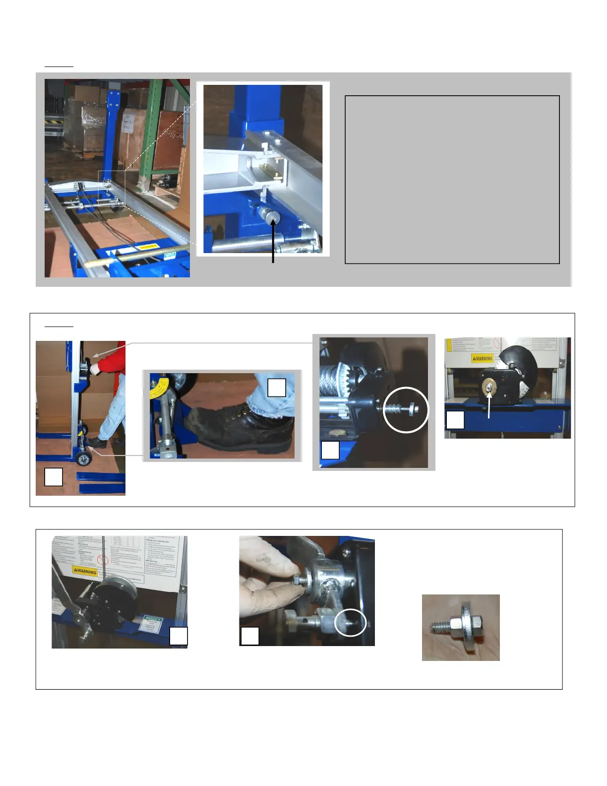 UStep 2U: Lift the assembly to the upright position (photo a). Then, lock the brakes (photo b) and fasten the winch handle