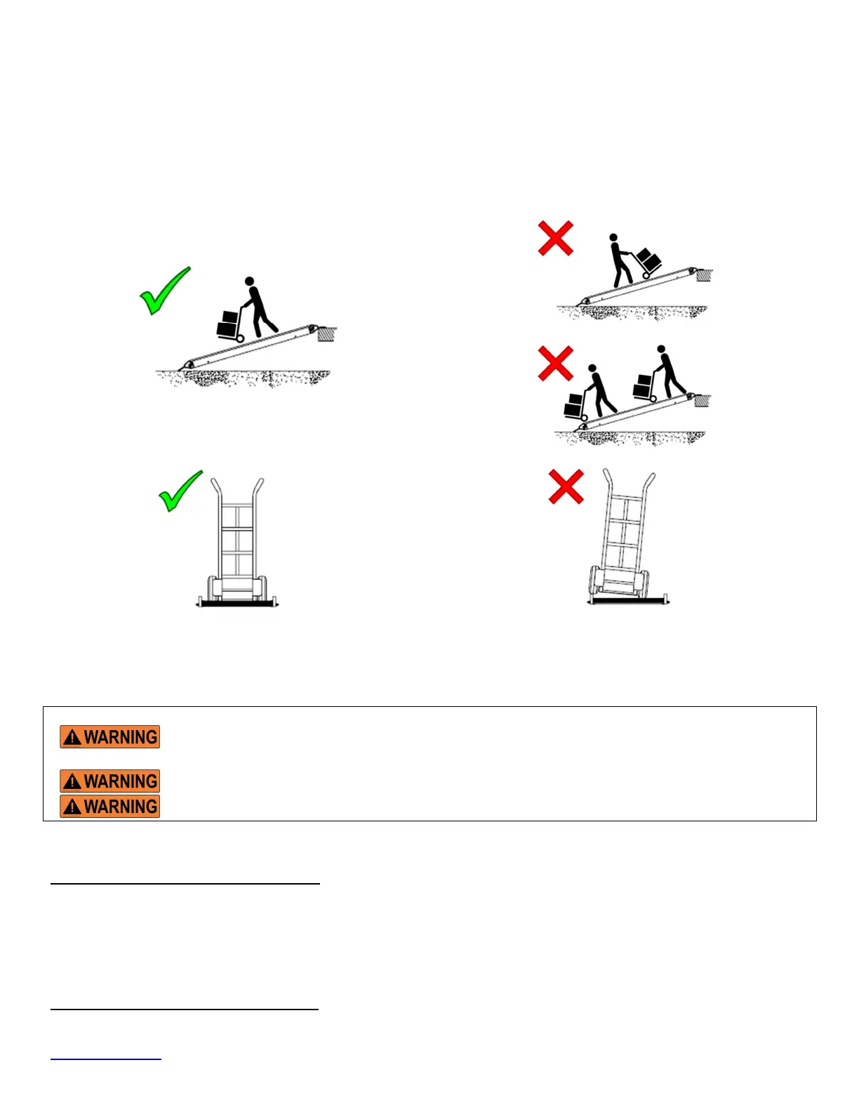 Keep the cart centered on the ramp. Do not attempt to use a cart having an outer wheel track wider than the