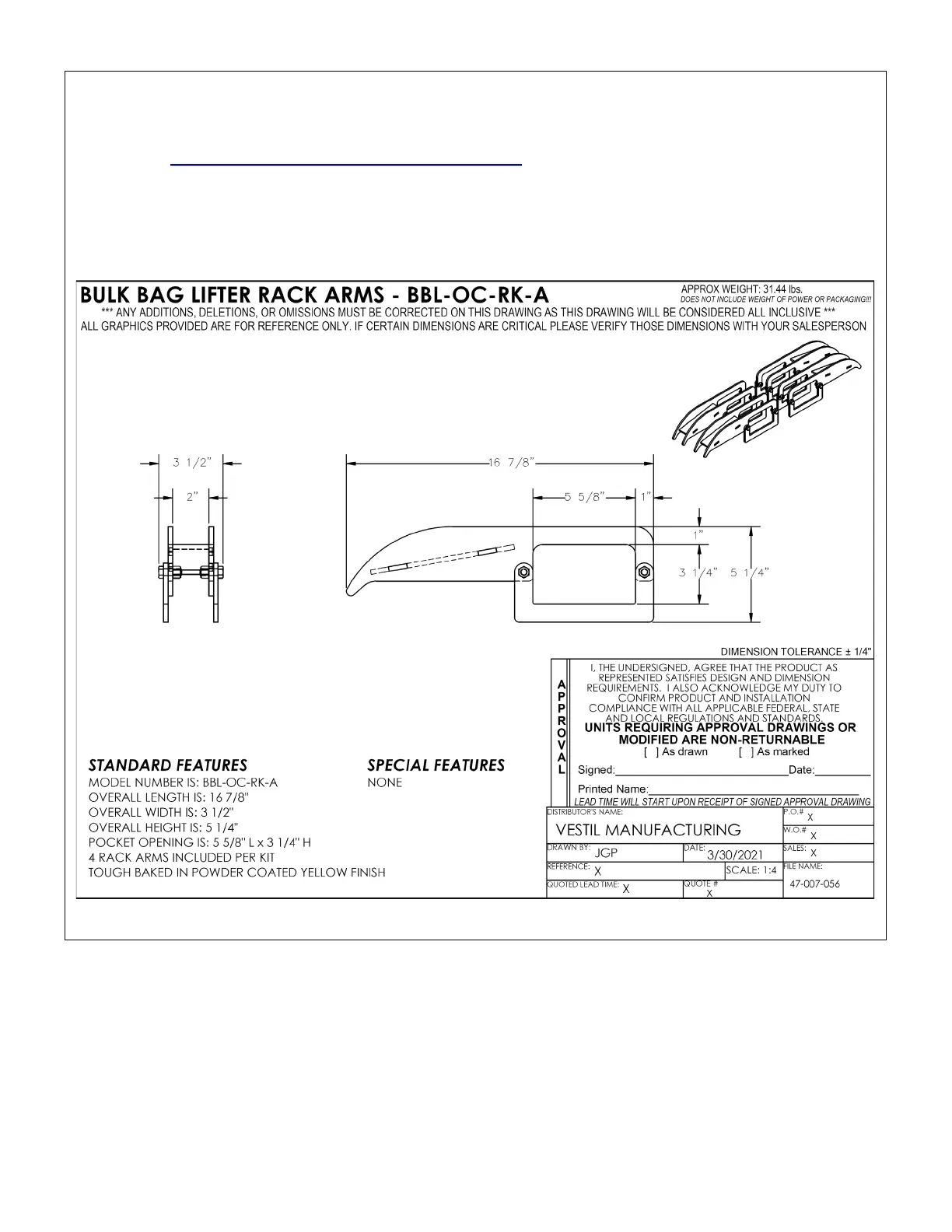 Specifications for the model BBL-OC-RK-A rack arms for BBL-OC-4 bulk bag lifters are provided