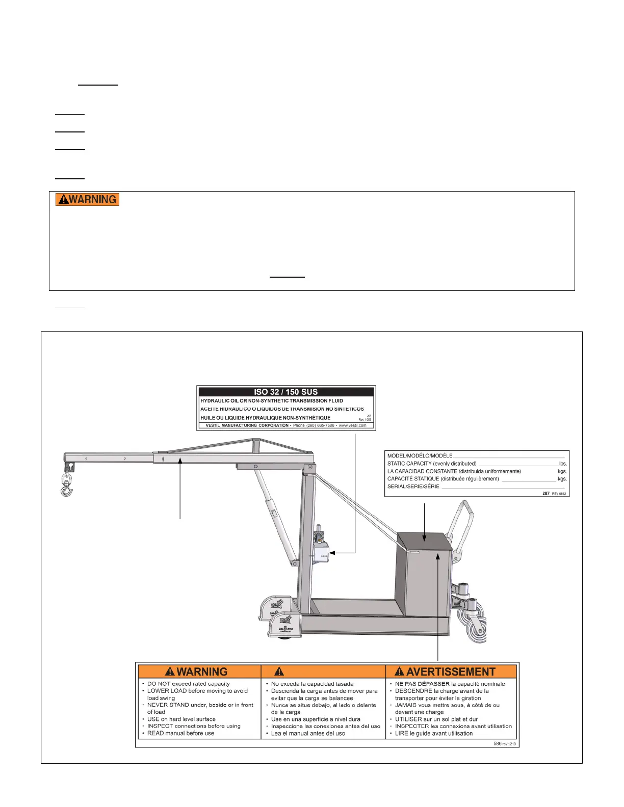 The floor crane should be labeled as shown below. Replace all labels that are missing, faded, or not easily