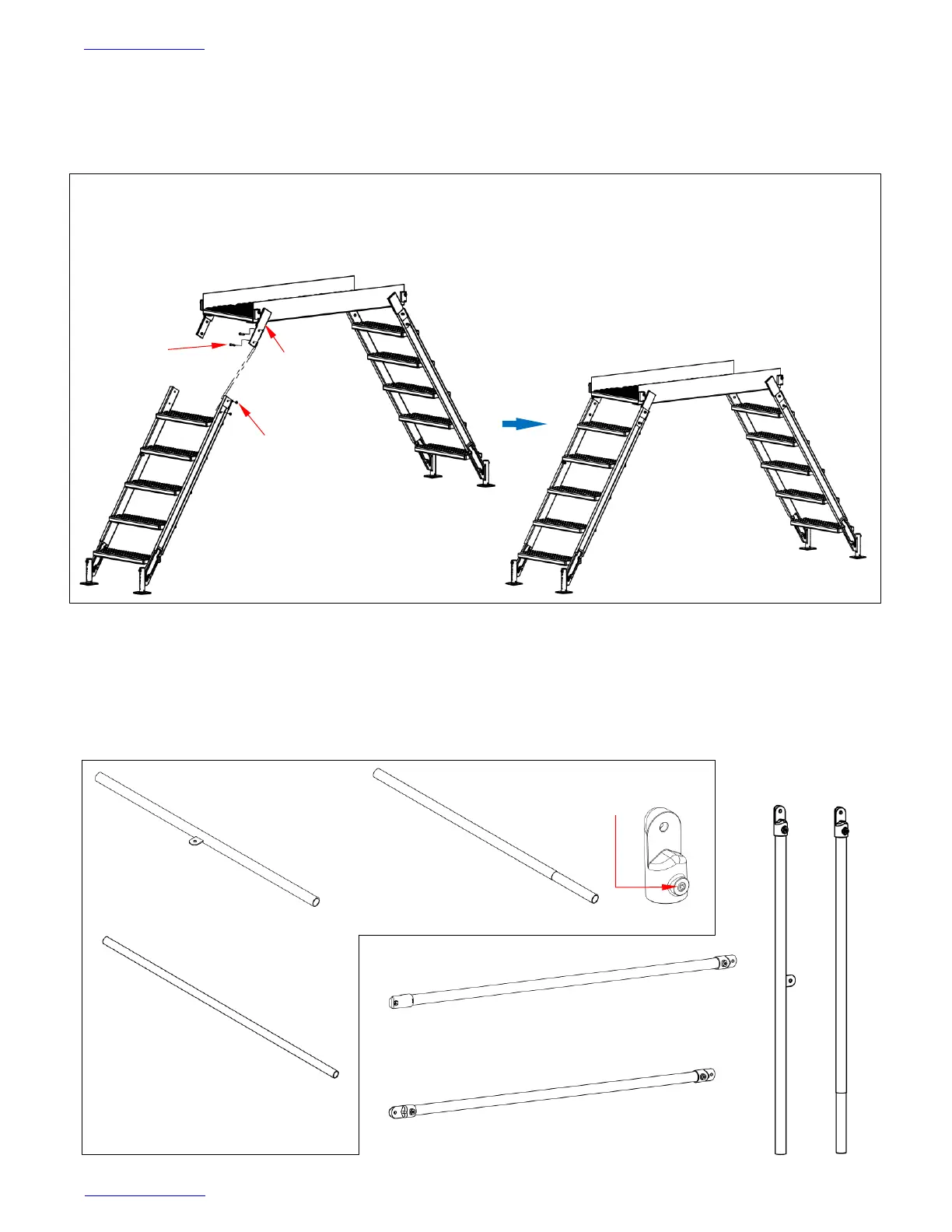 This crossover ladder is shipped in a disassembled state. Fasten each of the stairway segments to the