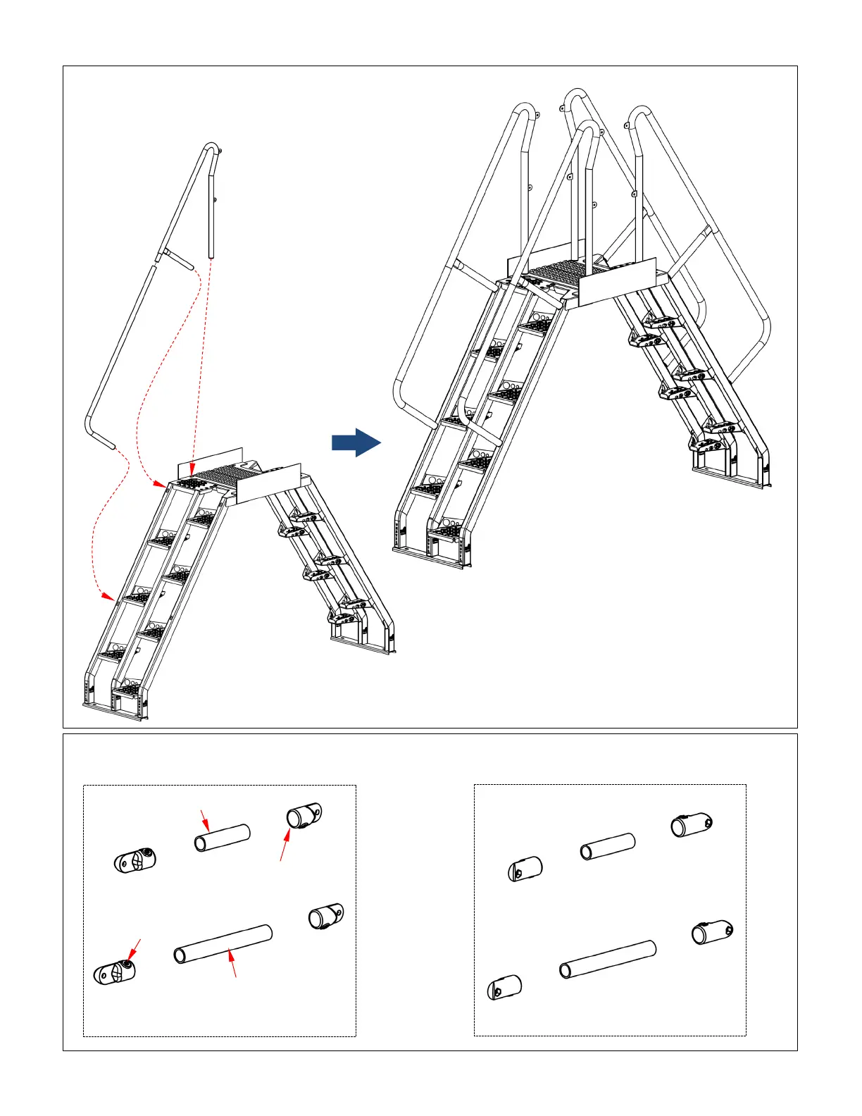 STEP 3: Press a handrail coupler (“pipe end” 44-516-016) onto each end of the top and middle handrails. Tighten