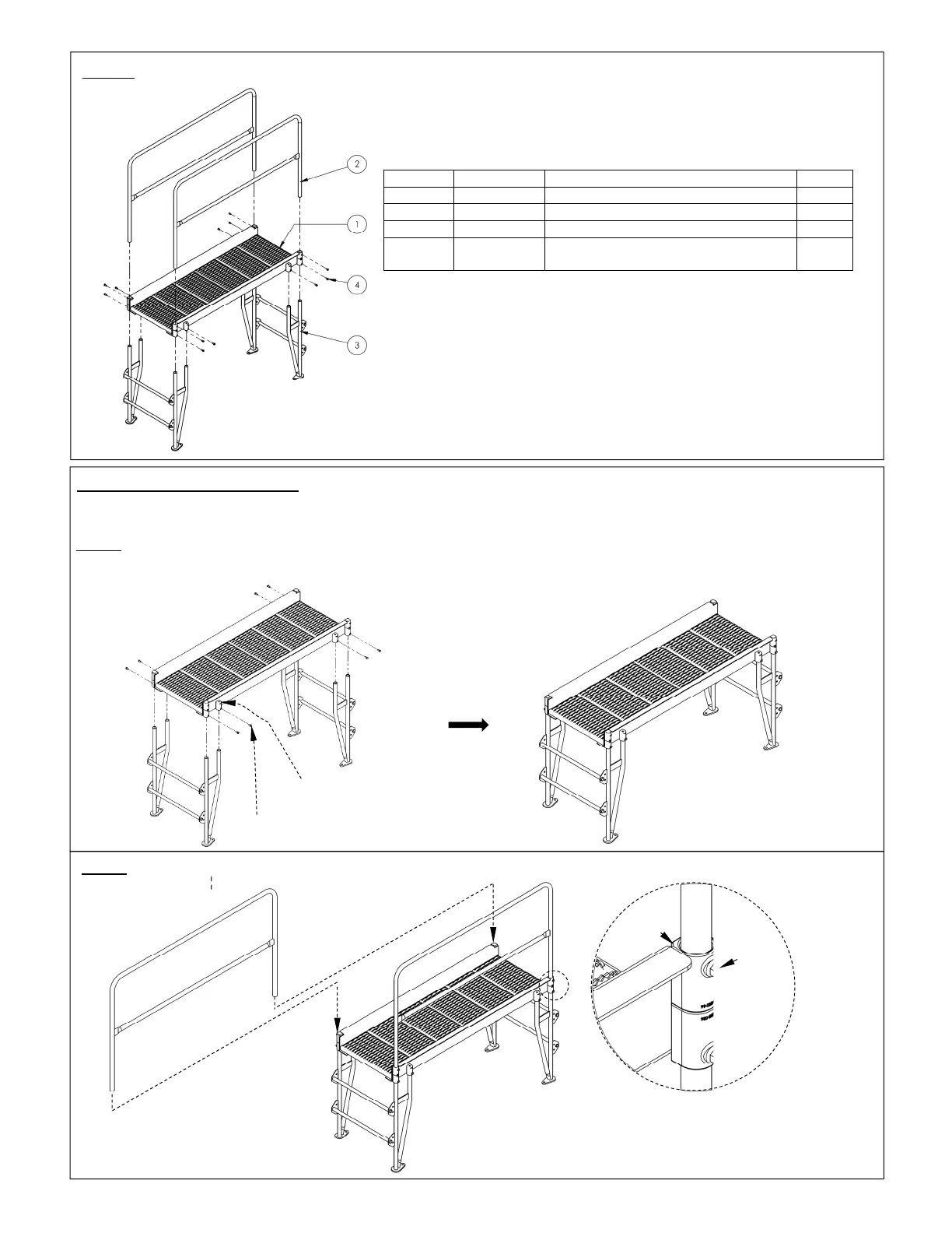 Step 1: As shown in the diagrams below, attach the deck (1) to the step segments (3) by inserting the side rails into