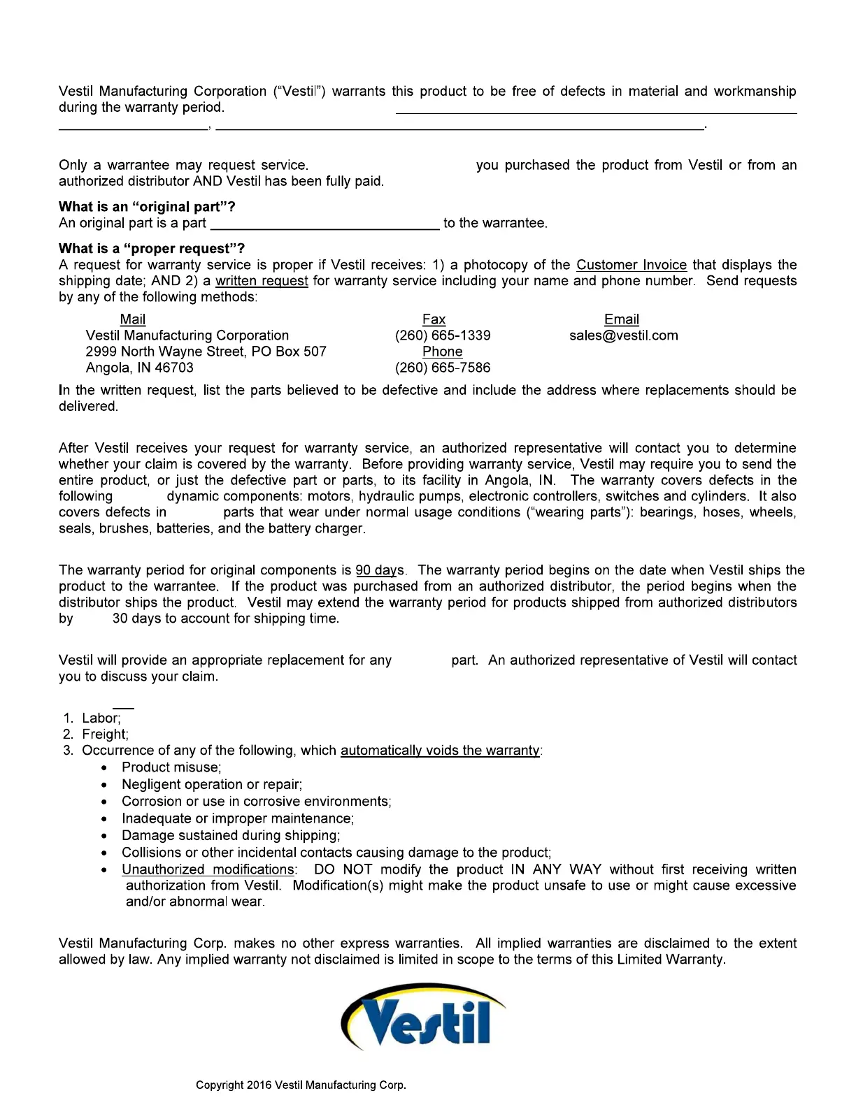 If a defective part is covered by the warranty, what will Vestil do to correct the problem?