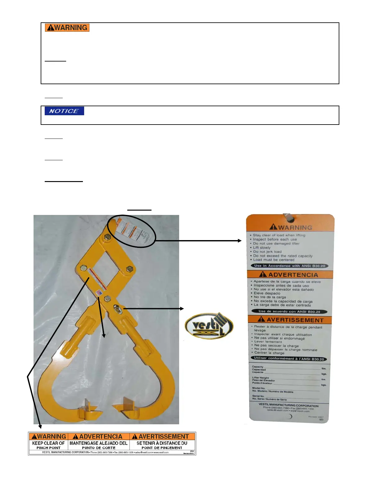 Only use the tongs if ALL of the labels are readable and undamaged. Contact Vestil for replacement