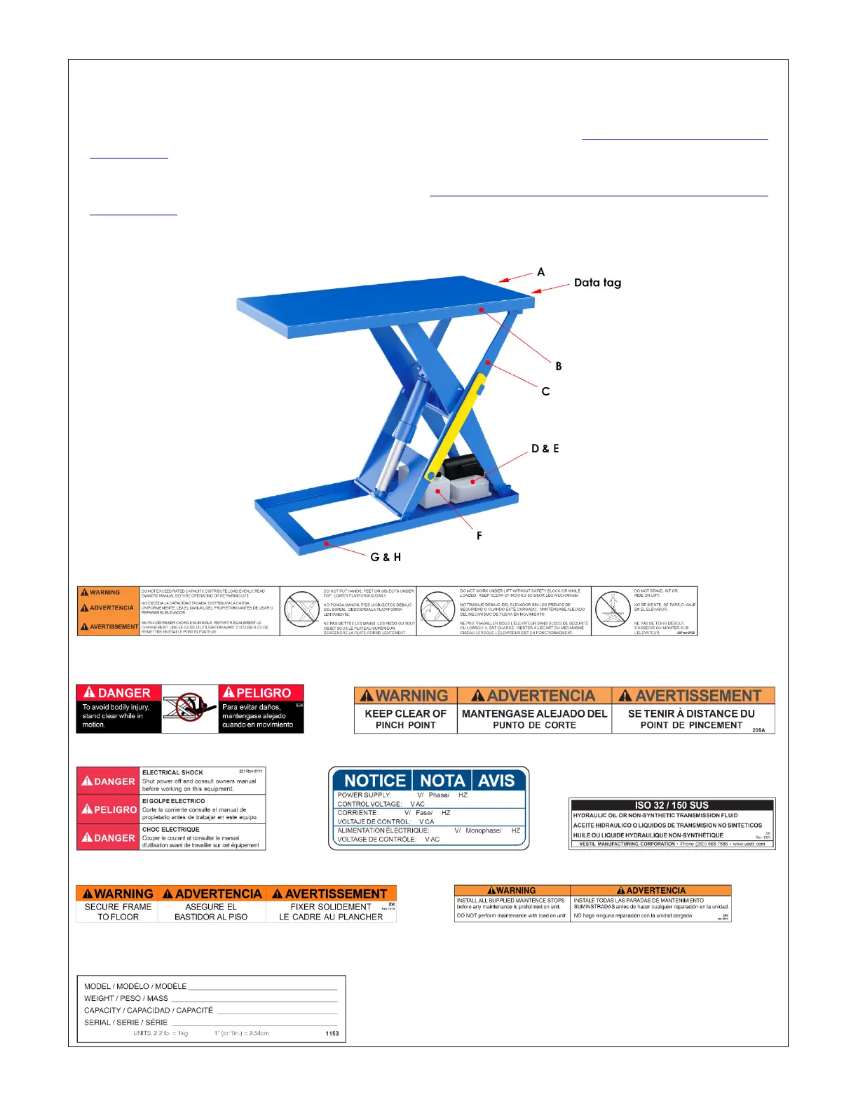 The lift table should be labeled as shown in the diagrams. However, label content and location