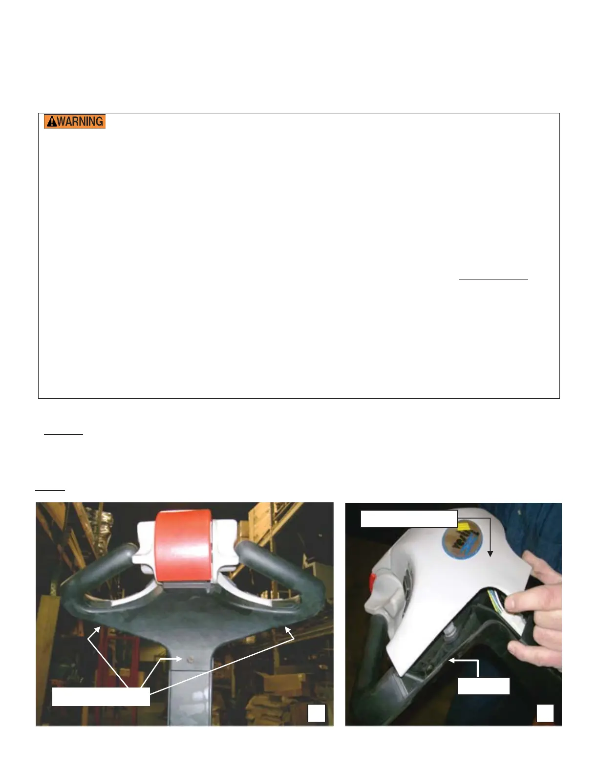 x Operating the pallet truck when battery voltage is low can cause premature motor contact failure.